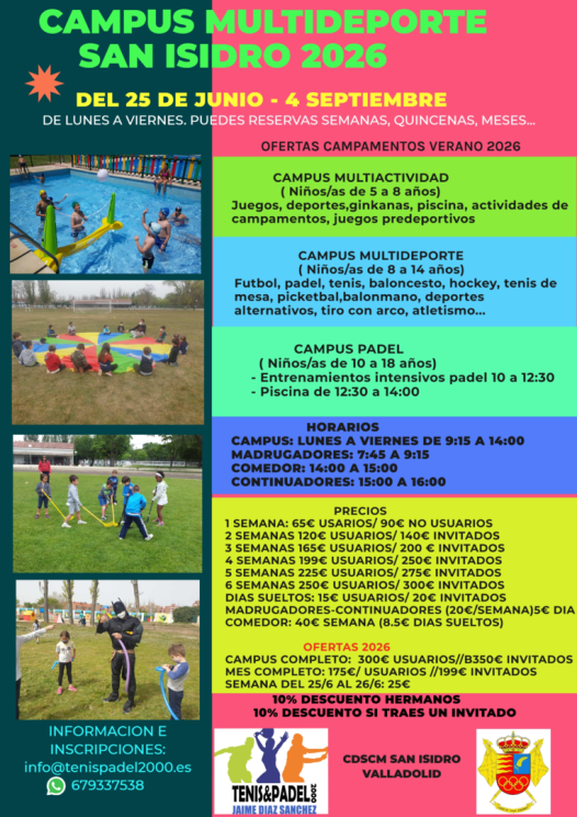 2. CAMPUS MULTIDEPORTE. Para niños/as desde los 8 a los 14 años. Padel, tenis, futbol, basket, futbol splass, kick ball, tiro con arco, ginkanas,olimpiadas deportivas etc..